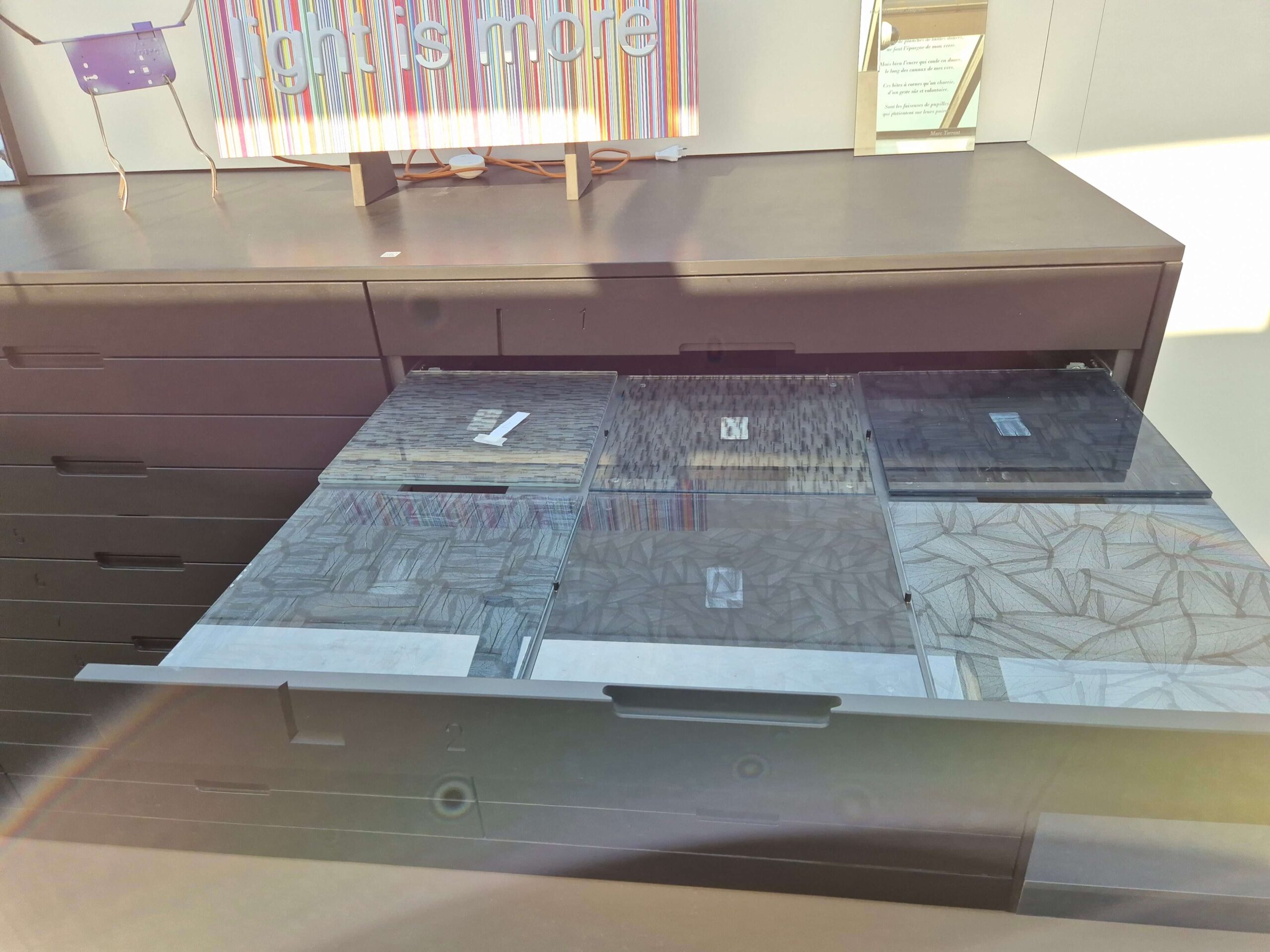 Echantillion physique : oui Emplacement meuble L , tiroir 2 , place EF Choix couleur : non Format maximum: 3000 mm x 1500 mm